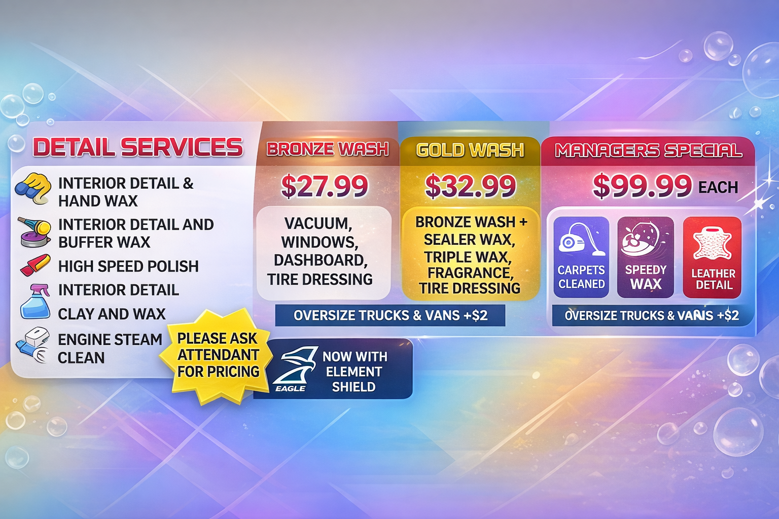 From quick exterior washes to full interior detailing, our team works hard to keep your vehicle looking its best.